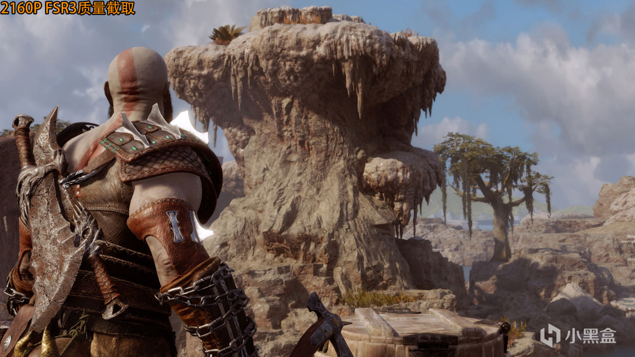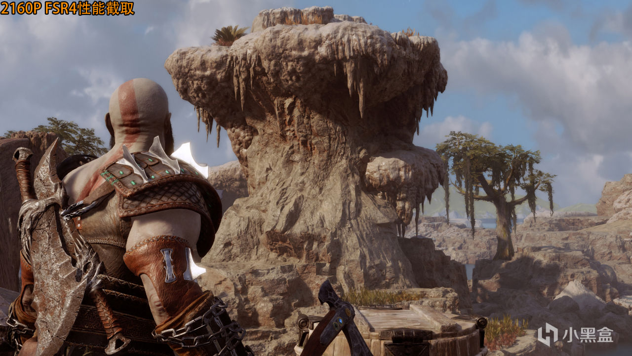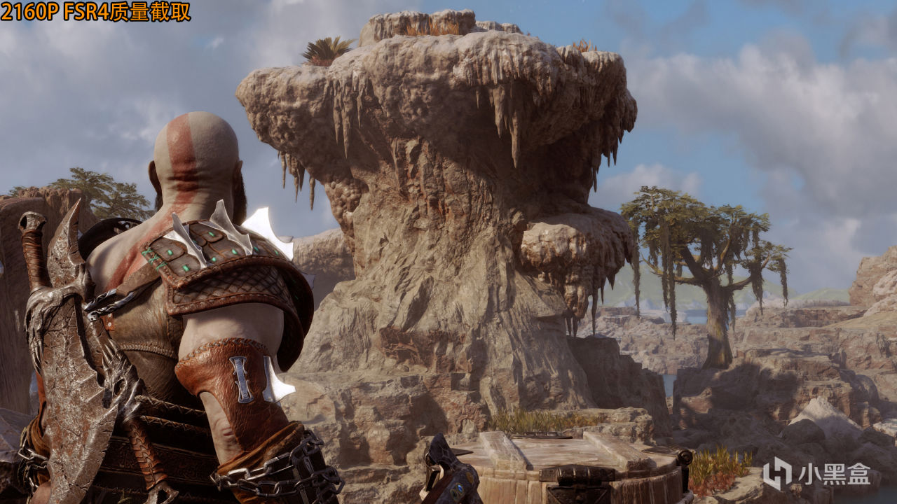 處於中間相對近視角的區域,四組對比人物和武器的紋理清晰度基本差不多,區別在於奎爺的鬍子區域,即便他是背對只展示了一小部分,仍可以看到TAA抗鋸齒處理過後仍留有明顯的毛刺感,其他三者則是FSR 4質量>FSR 3質量>FSR 4性能。而對岸的石柱物體,暴露了FSR 3對於遠景的處理,它的成像質量要遜色於TAA和FSR 4,注意這可不是什麼景深特效導致的。