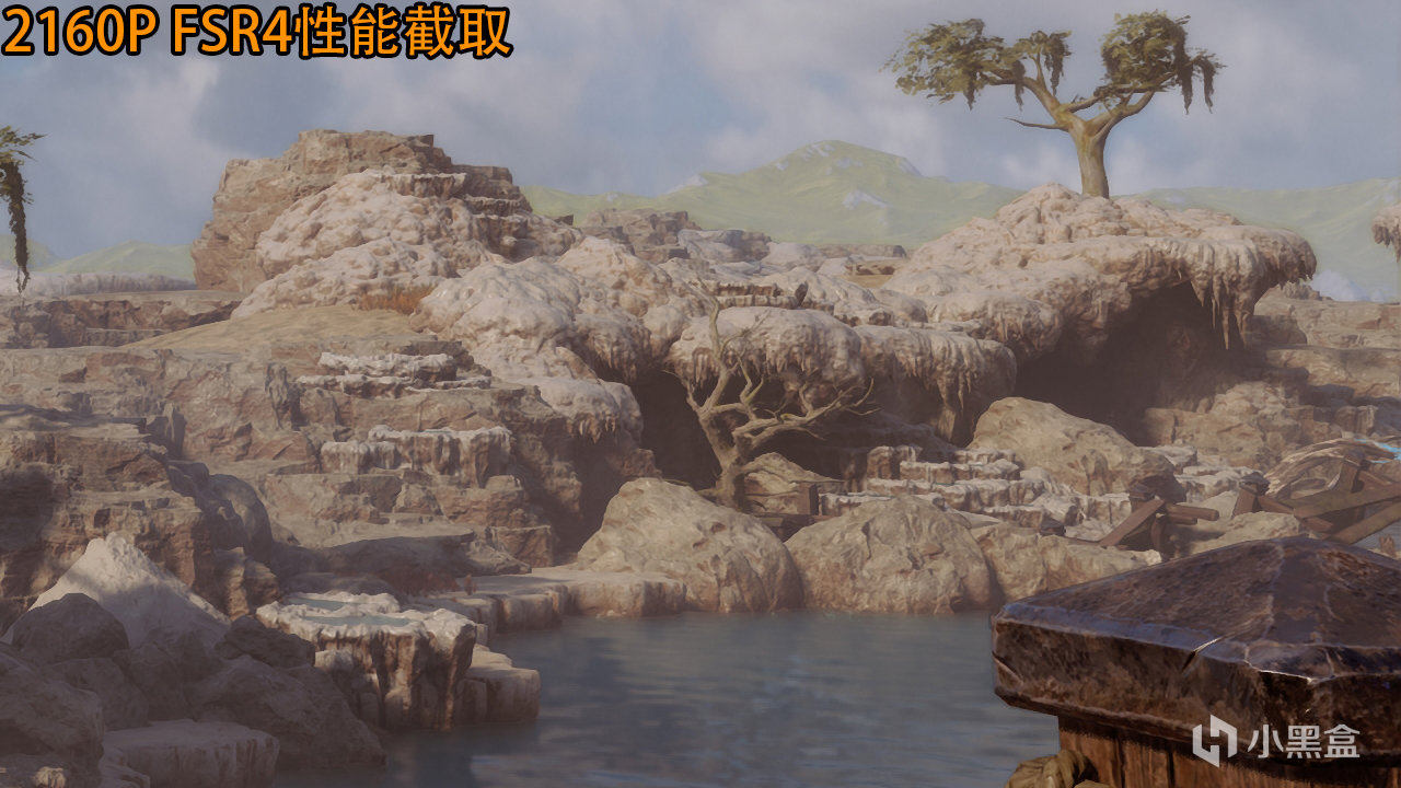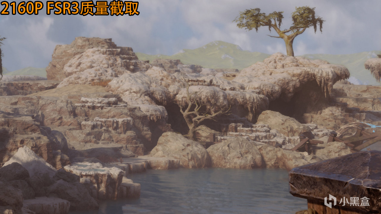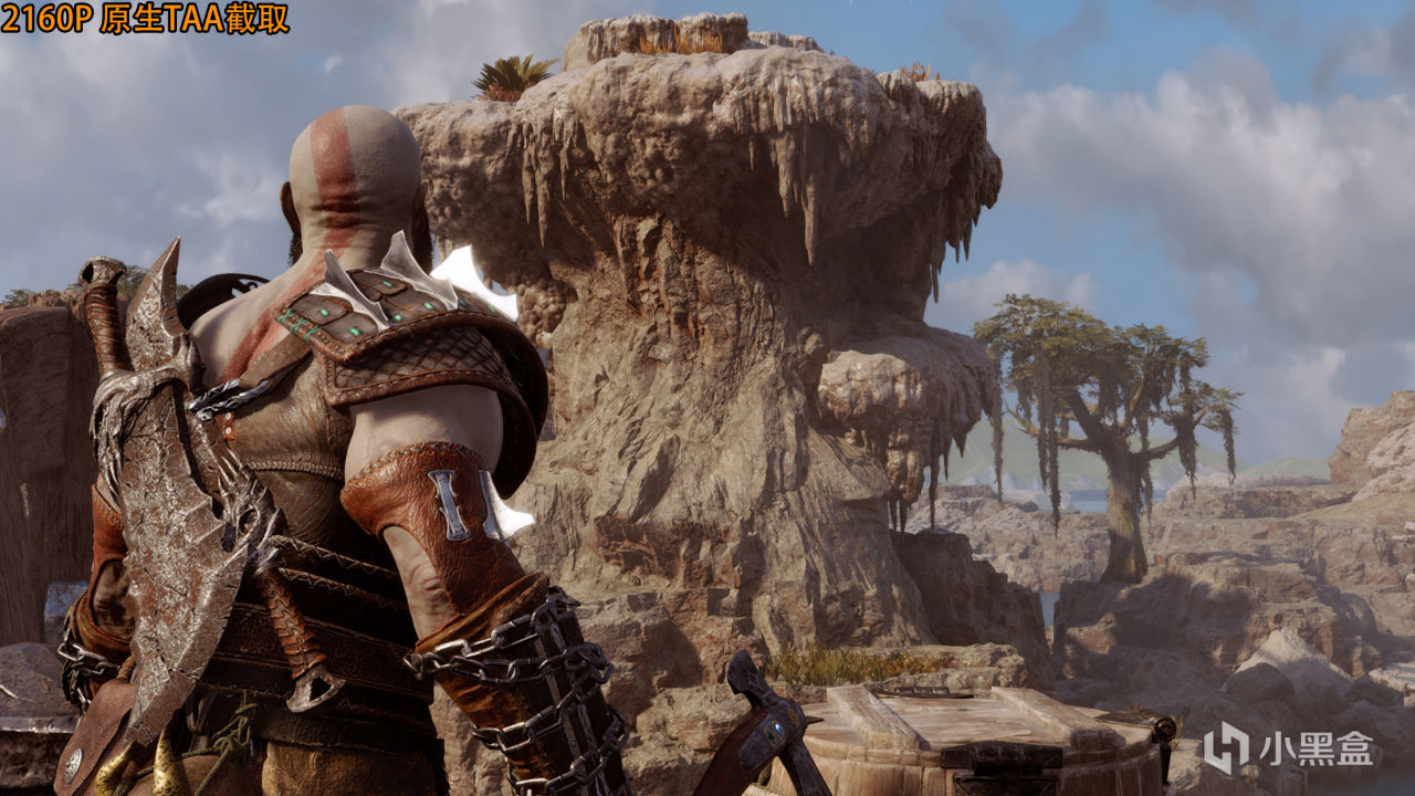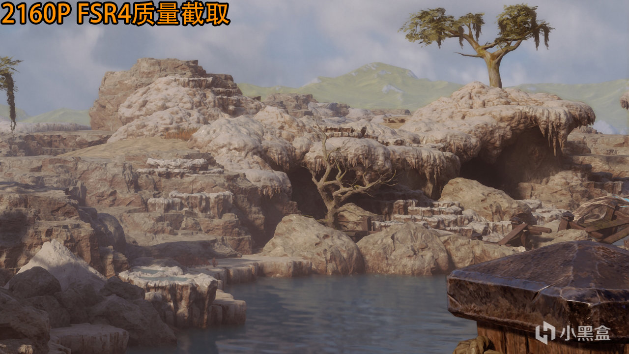 處於中間相對近視角的區域,四組對比人物和武器的紋理清晰度基本差不多,區別在於奎爺的鬍子區域,即便他是背對只展示了一小部分,仍可以看到TAA抗鋸齒處理過後仍留有明顯的毛刺感,其他三者則是FSR 4質量>FSR 3質量>FSR 4性能。而對岸的石柱物體,暴露了FSR 3對於遠景的處理,它的成像質量要遜色於TAA和FSR 4,注意這可不是什麼景深特效導致的。