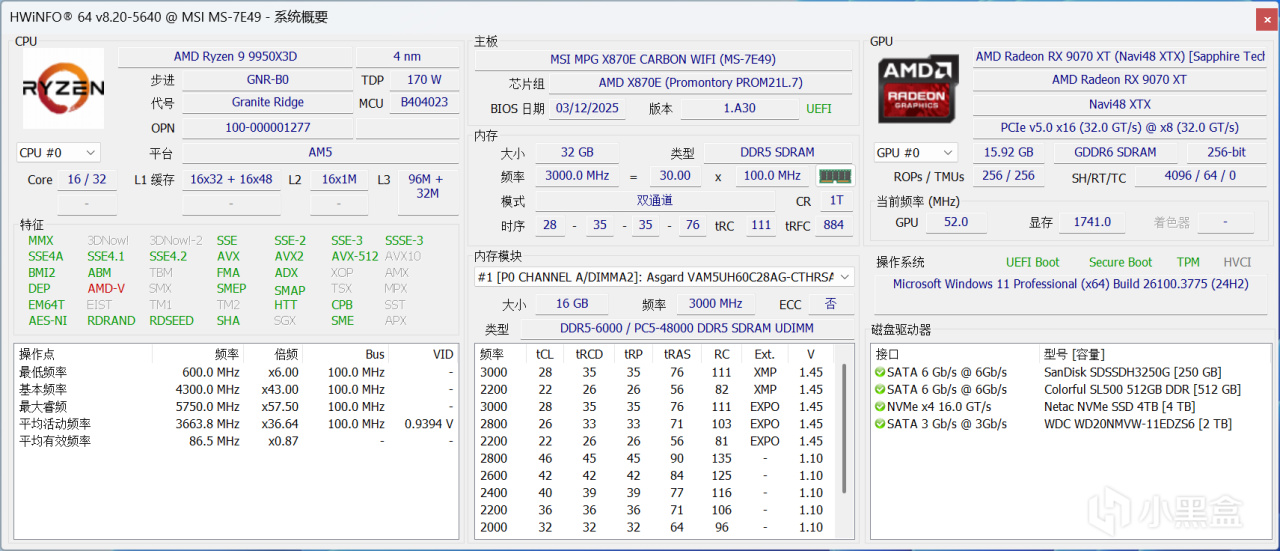 安裝的是Adrenalin 25.3.2 Optional最新顯卡及芯片組驅動,操作系統是Windows 11 24H2最新版本,CPU是AMD 銳龍9 9950X3D開啓PBO ENABLE狀態,搭配兩根DDR5 6000C28 16GB*2內存套裝,並啓用Resizable BAR技術(SAM)最大化顯卡性能。
