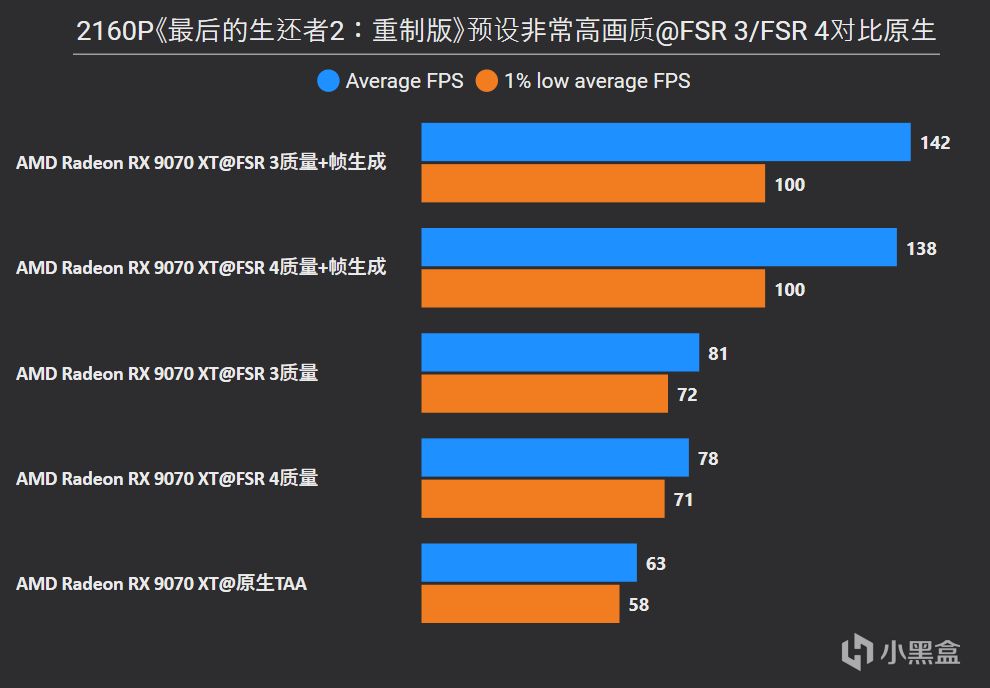 最後用RX 9070 XT測試一下幀率表現,三款遊戲在4K原生抗鋸齒情況下,平均幀率已經高於60fps,而藉助FSR 3/FSR 4質量+幀生成後,幀率都可以輕鬆翻2倍。另一方面,FSR 4的CNN屬於AI模型具備額外計算特性,所以FSR 4幀率相比FSR 3會下滑3%~6%,不過這也給玩家留有更多的選擇空間,追求極限幀率可選擇FSR 3,比如競技類遊戲,追求畫質至上自然就是FSR 4。