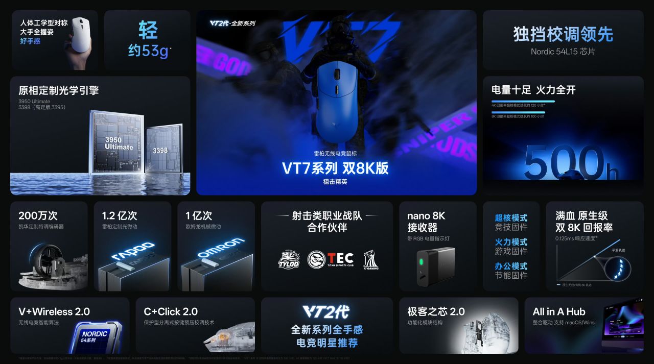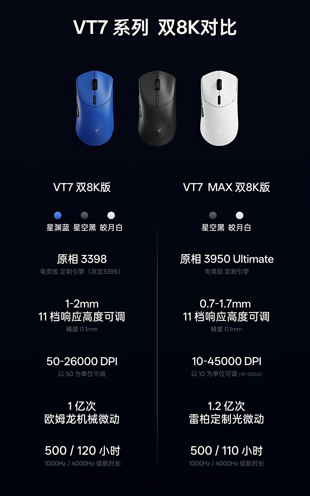 而VT7采用的是对称式外观设计,同样为有线无线双8K回报率,800mAh电池,Nordic 54L15主控芯片,原相3398/3950Ultimate传感器,欧姆龙机械微动/雷柏定制光微动,相同的53g重量。