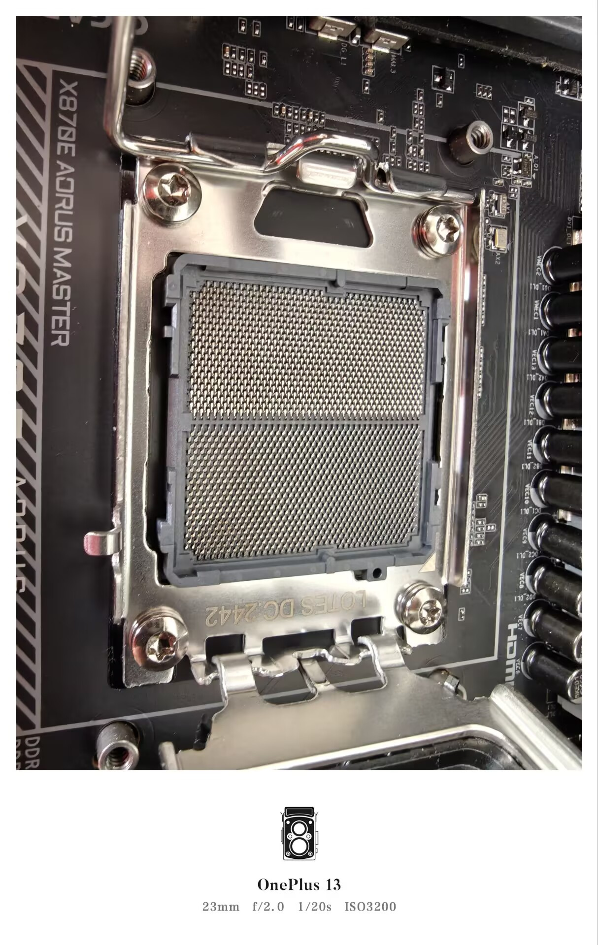 上次拆装机换CPU,发现扣具上有残余的硅脂,遂拿卫生纸擦,没想到纸巾勾了一下CPU针脚,然后它就歪了,别看平时压紧CPU特别费力,其实CPU针脚是镀金铜,铜是非常柔软的,因此触碰针脚就容易使其变歪。上次遭殃的就是这块X870E超级雕,作为技嘉旗舰级主板,价格来到近4K,这么一搞损失就大了,不知道维修要多少钱,当时内心慌的一笔。