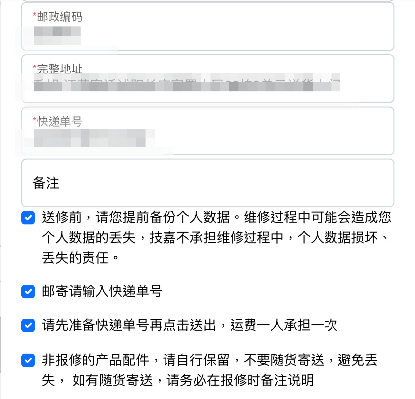 还有一点比较不一样的是,技嘉的主板保修没有在线审核,用户直接填返回单号就行,上面一步有服务中心地址信息后,自己找个快递上门取件,在线填的快递,单号生成很快,我自己建议在快递中还是把自己的个人地址、主板问题再写一下,方便维修点核对。