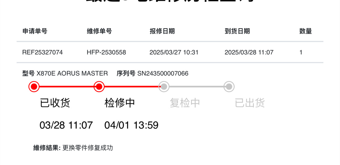中途想要看维修进度,可以再次在公众号中查看,我这里3月27日发货,4月1号查看显示更换零件修复成功,修复后还有个复检过程,耐心等待即可,4月5号 的时候,我就收到顺丰返回的主板了,整个时间大概一周,算上快递时间,技嘉维修的时间大概4天,很快。