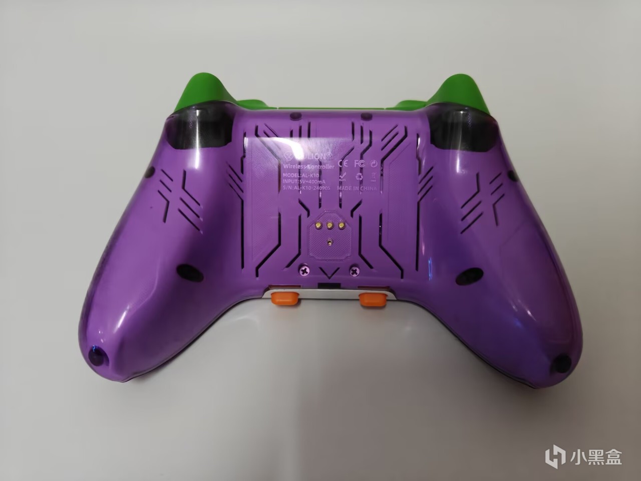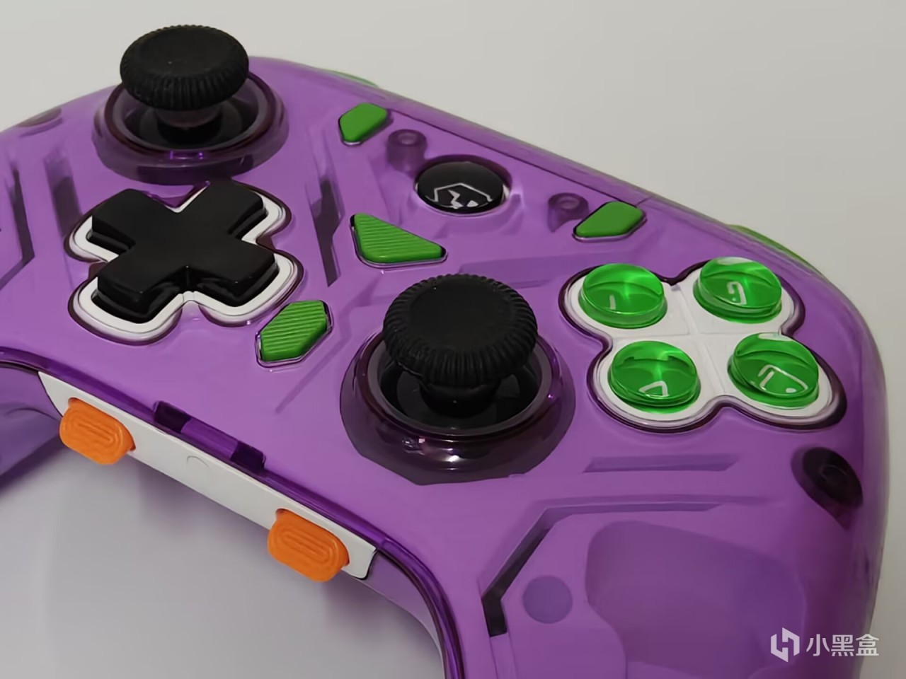顏值是K10的重點,目前是白、紫、粉三種配色,但是宣傳圖和包裝上是白、紫、橙,這點屬實沒看懂。不過既然都叫福音K10了,重點肯定是紫色,其他顏色可以放放,這紫色的主色調搭配上綠色的按鍵,真的有初號機那味了,買這款手柄真得買紫色吧。