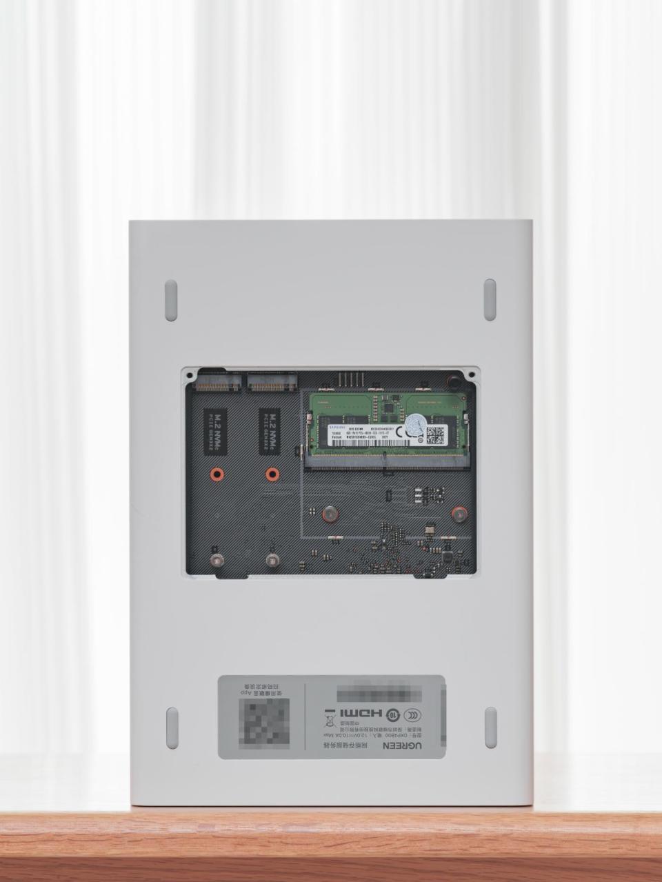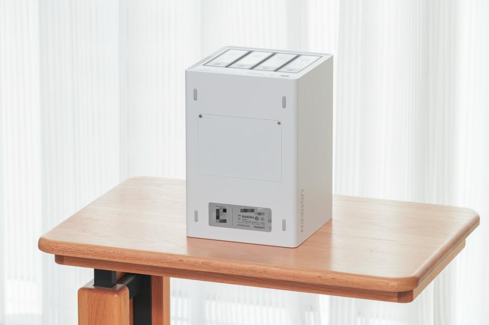 首先它的包裝就是白色的,產品也是純白系,相比於冷峻的黑色,真的是居家百搭。材質方面,NAS 的外殼爲鋁合金,表面有着緻密的噴塗工藝,觸感可以說是非常光滑,同時側面還印有“UGREEN”的字樣。
