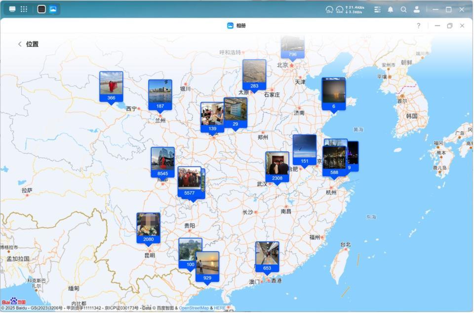 對於喜歡旅遊的用戶,在綠聯的 AI 相冊中,它還能夠根據照片 EXIF 信息中的 GPS 數據,在地圖上爲你標註照片的拍攝地址。這樣一來,你就可以清晰直觀的看到自己在國內大好河山上的行程記錄,也便於你快速的找回旅遊的美好記憶。