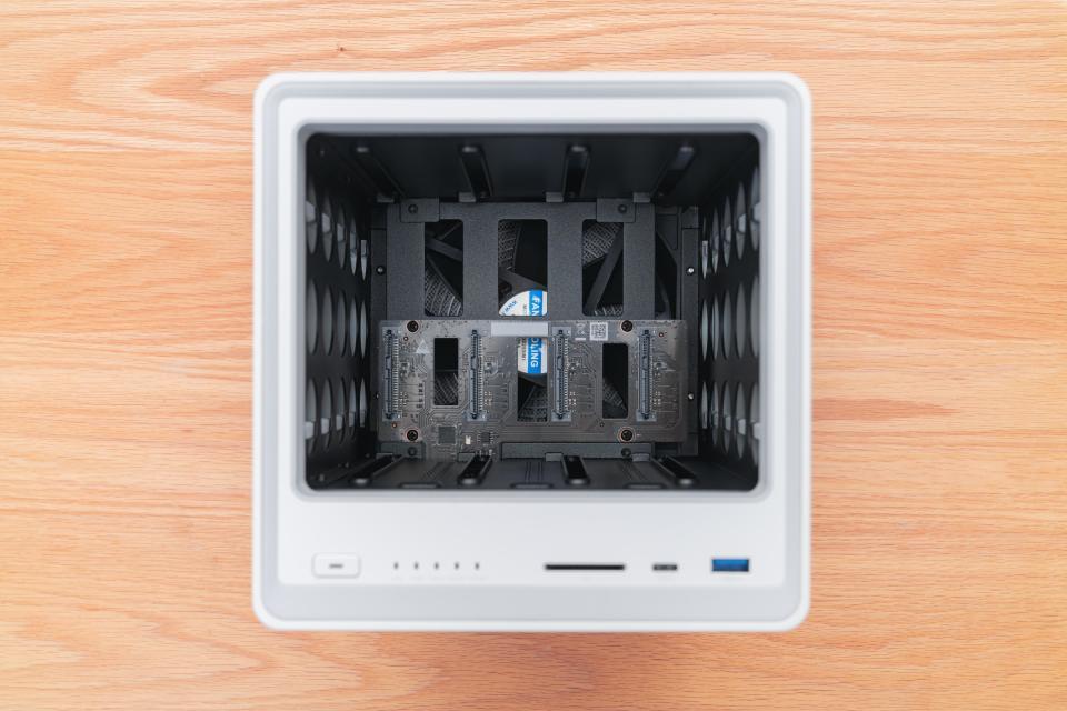 取出硬盤支架之後,還可以看到內側的 4 個硬盤接口以及一個偌大的風扇模組,可以爲 NAS 提供有效的散熱。
