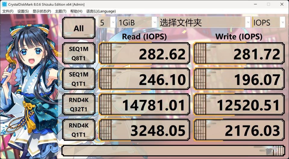 順序讀寫次數分別達到 282.62 IOPS 和 281.72 IOPS。4K 隨機讀取次數爲 3248.05 IOPS,隨機寫入次數爲 2176.03 IOPS。其中 RND4K Q32T1 隨機讀取次數爲 14781.01 IOPS,隨機寫入次數爲 12520.51 IOPS。