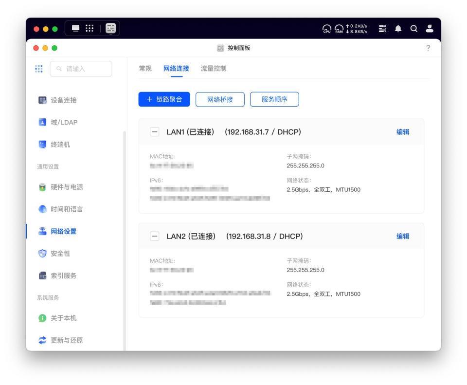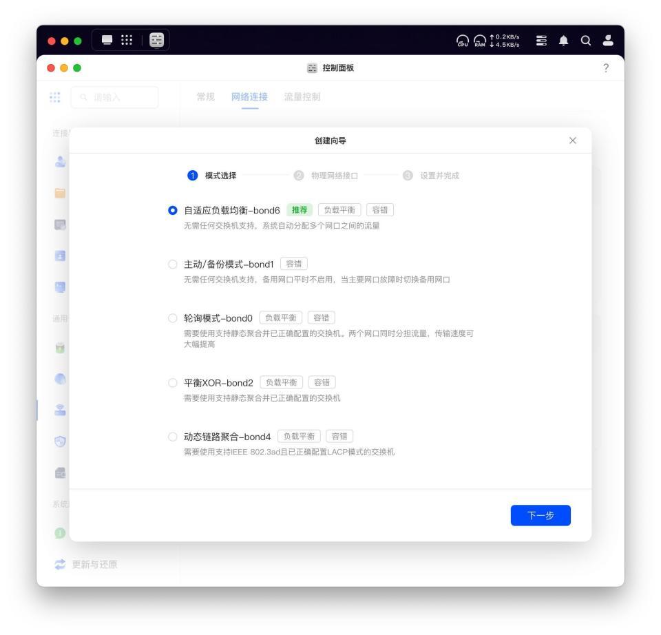 此外這款 NAS 的雙網口還支持鏈路聚合,我選擇的就是「自適應負載均衡」,無需交換機支持。如果是輪詢、平衡 XOR、動態鏈路聚合就均需要交換機具備該功能。