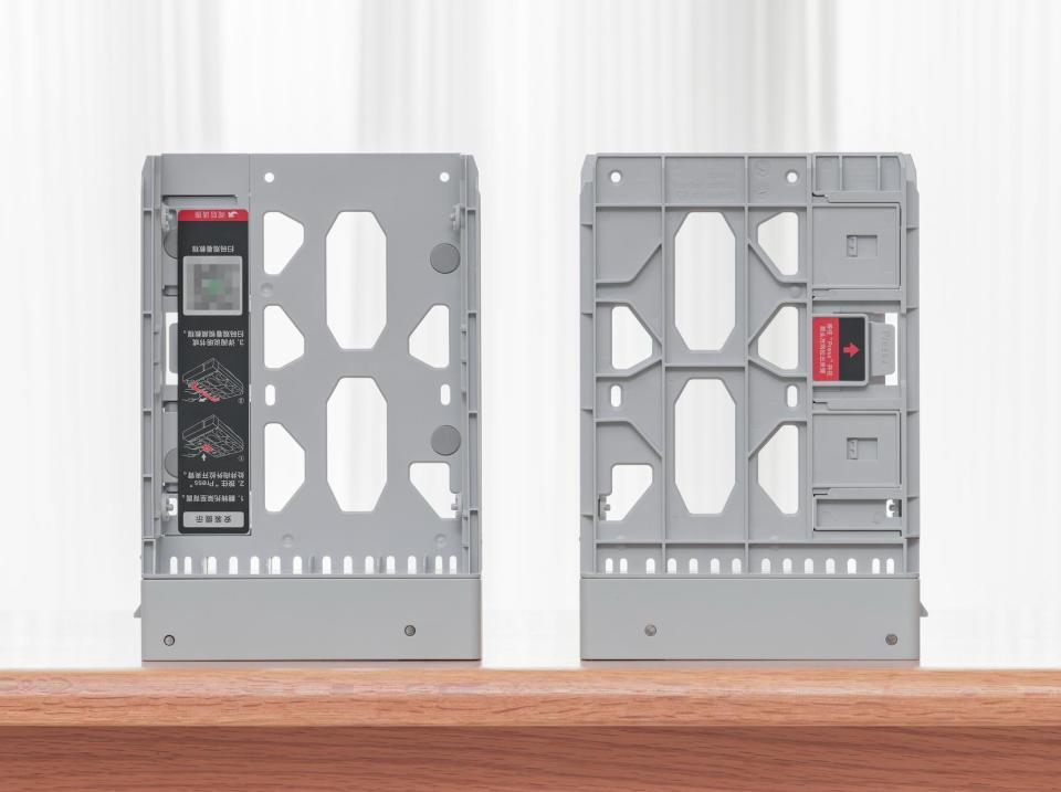 NAS 內置的硬盤支架也被刷成了淺灰色,而且它還有一個伸縮的卡扣設計,相比於過去那種需要上螺絲的硬盤支架可方便太多了。