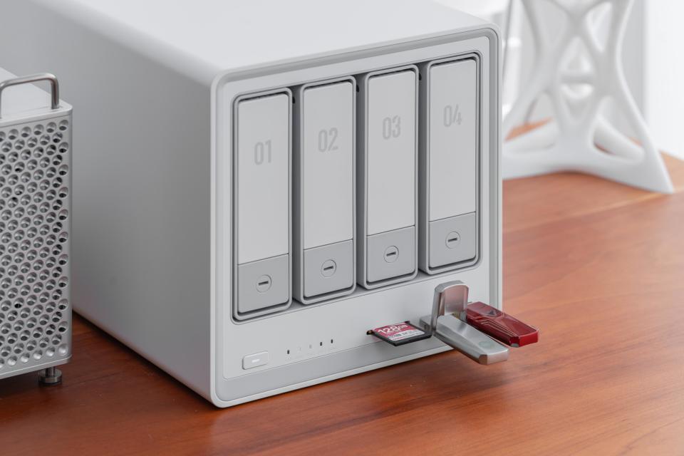 正面除了 4 個硬盤位外,還有着按鍵和端口,左下角是電源 + 4 個硬盤指示燈,右邊爲 USB-C(10Gbps)和 USB-A(10Gbps)端口,還有一個在 NAS 中特別少見的 SD 卡槽,對於相機用戶特別友好。