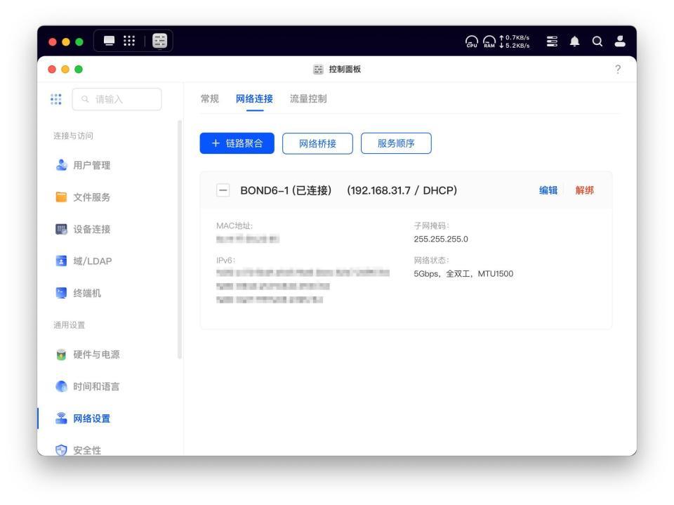 可以看到鏈路聚合之後,在 NAS 的網絡連接界面,網絡狀態已經變成 5Gbps,全雙工了,這個時候它的上行和下行都是可以跑滿 2.5Gbps 速率的。
