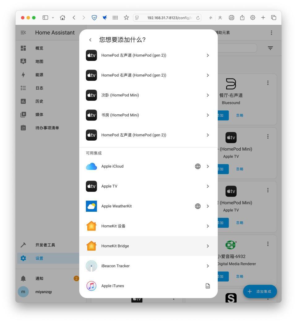 還是在同樣的添加集成中搜索“Apple”,打開下拉菜單選擇“HomeKit Bridge”。