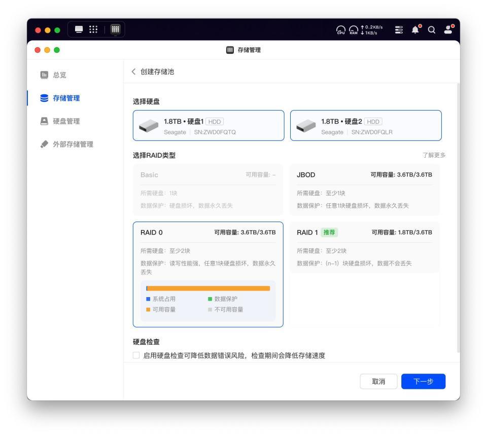 因爲單塊希捷酷狼(2TB) 的傳輸速率爲 180MB/s 左右,爲了儘可能的拉滿性能,所以我選擇了 RAID 0 的存儲池類型,可以讓數據進行並行處理,使其順序讀寫性能接近 360MB/s(兩塊磁盤性能之和),大於 2.5Gbps 的理論帶寬峯值 312.5MB/s。