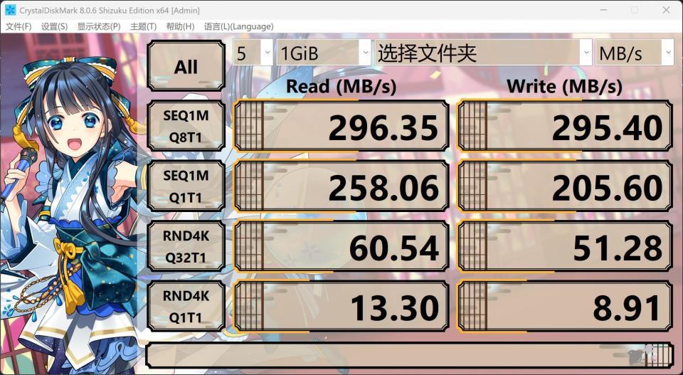 然後我把綠聯 DXP4800P 的共享文件夾映射到 Windows 電腦裏的網絡驅動器,使用硬盤測試工具測試理論性能。可以看到,通過 CrystalDiskMark 進行測試,順序讀取速度達到 296.35MB/s,順序寫入速度爲 295.4MB/s。4K 隨機讀取速度爲 13.3MB/s,隨機寫入速度爲 8.91MB/s。其中 RND4K Q32T1 隨機讀速爲 60.54MB/s,隨機寫速爲 8.91MB/s。