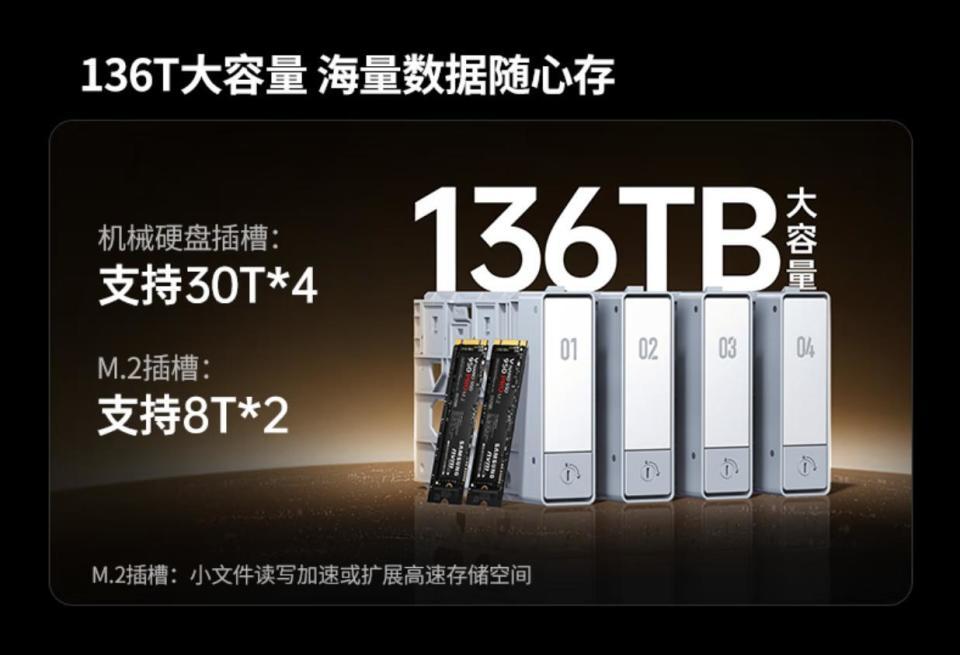 在硬盤配置方面,綠聯 DXP4800 白色款預留有 4 個 2.5/3.5 吋硬盤位和 2 個 M.2 2280 硬盤位,最大支持 136TB(30TB×4+8TB×2)的容量。如果容量堆滿,大概要花 3 萬元。