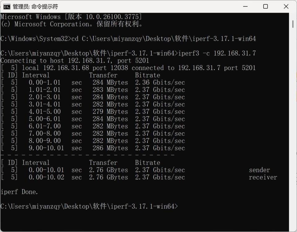 首先通過 Windows 主機端測試了下傳輸帶寬,因爲綠聯的操作系統默認內置了 iPerf3 工具,我們可以直接電腦端的命令提示符監聽 NAS,可以看到實測下來的帶寬爲 2.37Gbps。