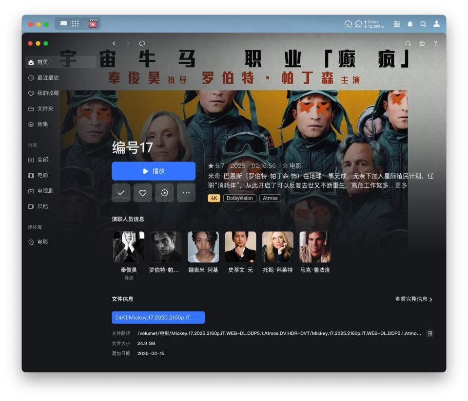 打開其中任意一部影片,比如下圖中就可以看到影片的海報、演職人員、視頻規格(4K/DolbyVision/Atmos)等信息。如果因爲搜刮的資源信息和片源匹配不正確,你還可以手動修改調整。