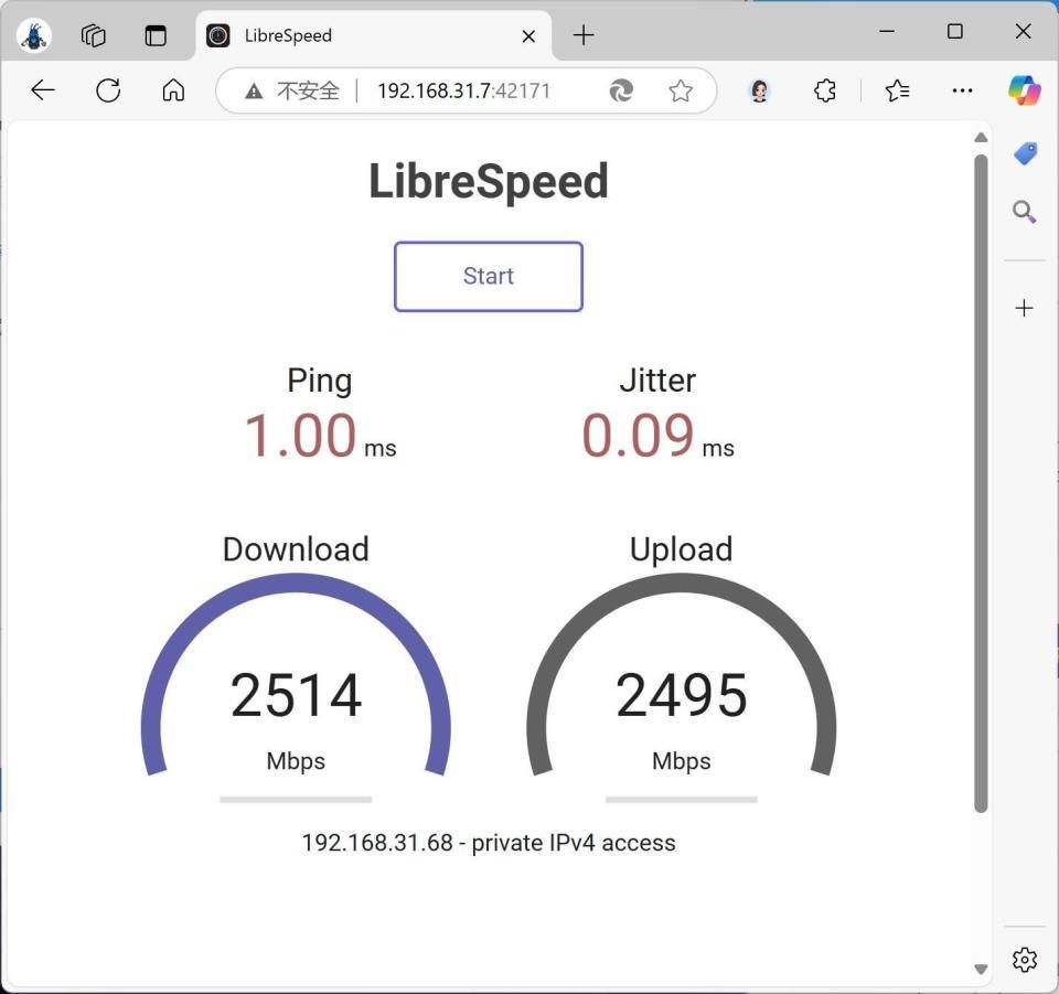 然後我在綠聯 DXP4800 裏面通過 Docker 安裝了一個 LibreSpeed 的測試工具,通過它來測試,NAS 的上行帶寬爲 2514Mbps、下行帶寬爲 2495Mbps。