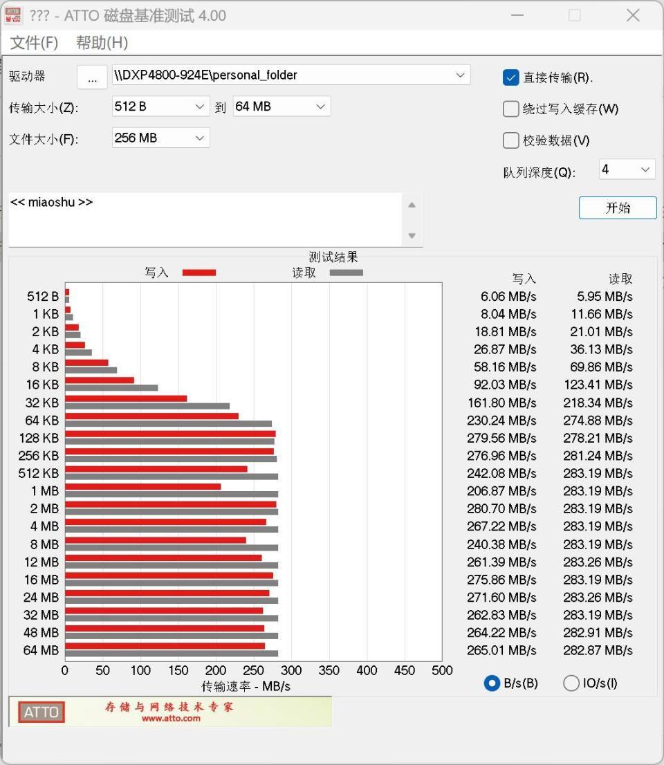 ATTO 磁盤基準,可以看到最大的順序寫入速率在 280.70MB/s,最大順序讀取速率在 283.26MB/s。