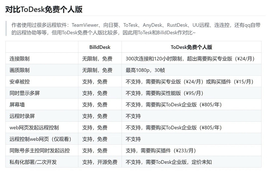 項目作者也體驗了很多遠程工具,而且他也知道大家目前用得比較多的是Todesk免費版,還特地做了一個對比,很自信。