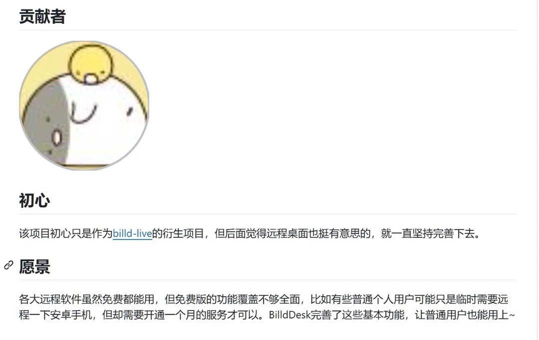 而BilldDesk的願景和起點僅僅是臨時用的時候能免費用一下就行,不想要開通會員的提示,而貢獻者目前顯示就作者一個人,是覺得遠程桌面挺有意思才做的。