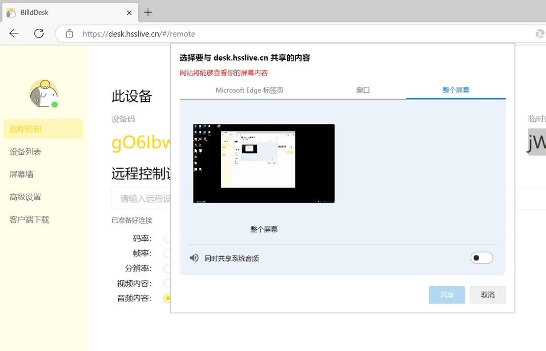 如果對面沒有安裝軟件,也可以通過網頁共享屏幕,但是不能控制。