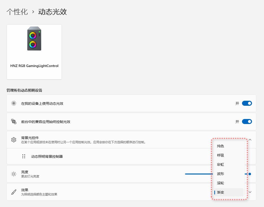 在Windows 11 24H2系统中,动态光效管理已被集成在系统中。这意味着用户无需再单独打开灯控软件来启动灯效,只需直接在系统效果设置中选择自己喜欢的光效即可。