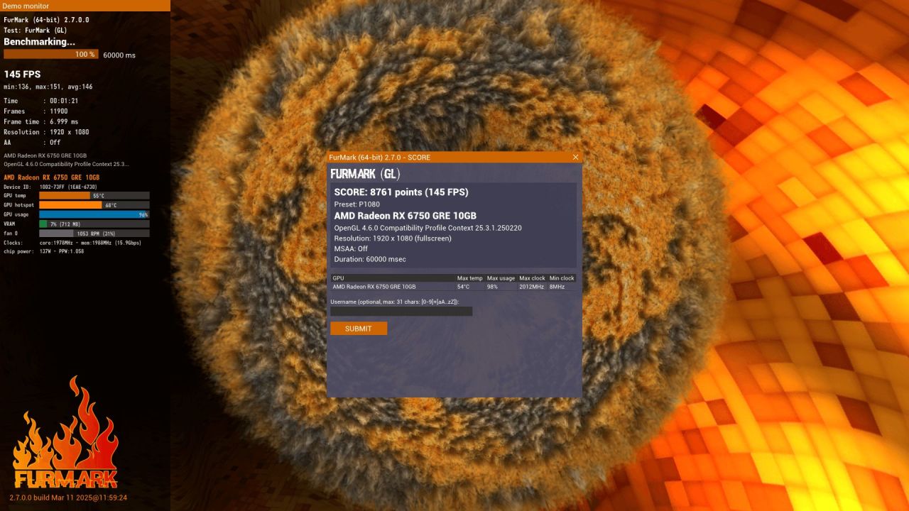 用FurMark软件测试,1080P分辨率得分:8761,帧率为:145 FPS。
