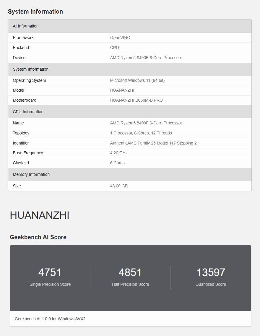 用GeekBench AI软件进行AI性能评测,在OpenVINO项目下进行CPU算力测试,Single Precision得分为:4751,Half Precision得分为:4851,Quantized得分为:13597。