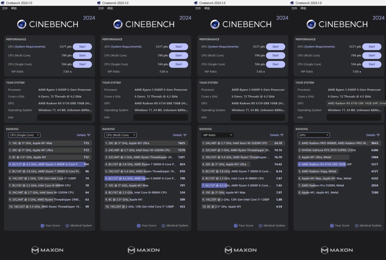 使用CINEBENCH 2024软件测试,CPU单核性能得分:104 pts,CPU多核性能得分:798 pts,MP Ratio得分:7.65 x,GPU性能得分:5571 pts。