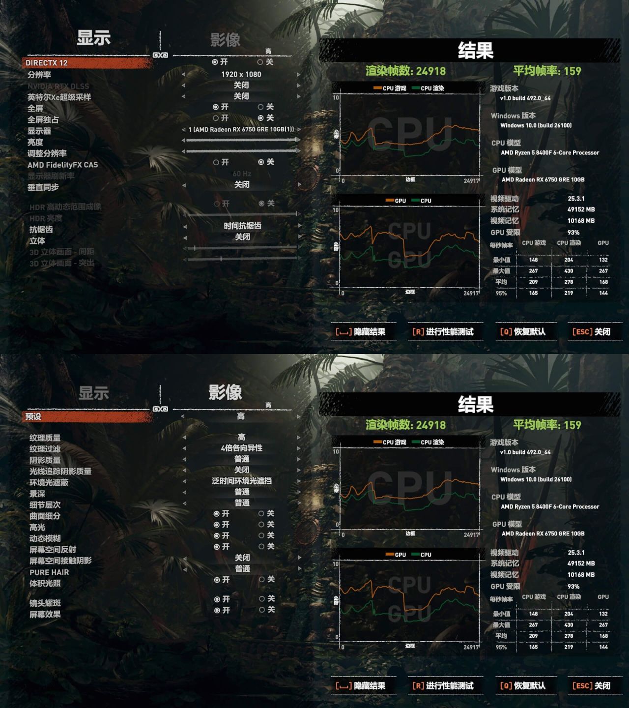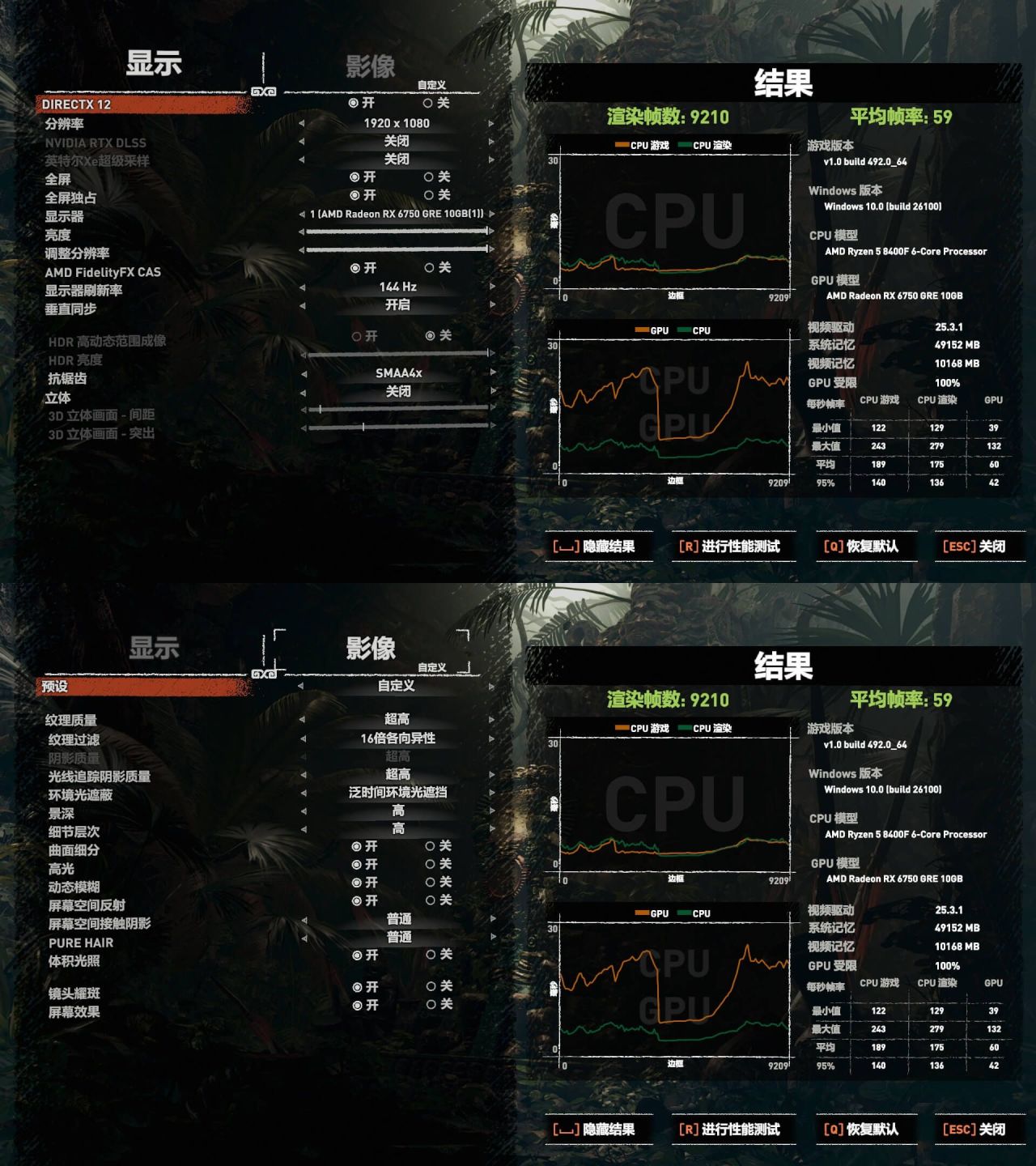 经过实测,在玩《古墓丽影:暗影》这款游戏时,使用AMD 锐龙 5 8400F处理器和AMD Radeon RX 6750 GRE 10GB显卡进行测试,在默认预设高画质下,实测1080P分辨率(1920× 1080)运行游戏,画面平均帧率能够稳定保持在159 帧/每秒;在自定义最高画质下,实测1080P分辨率(1920× 1080)运行游戏,画面平均帧率能够稳定保持在59 帧/每秒。