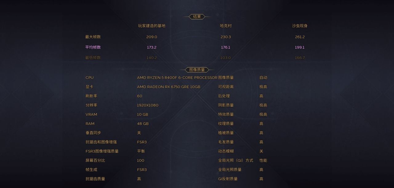 经过实测,在玩《沙丘:觉醒》这款游戏时,使用AMD 锐龙 5 8400F处理器和AMD Radeon RX 6750 GRE 10GB显卡进行测试,在自定义画质下,实测1080P分辨率(1920× 1080)运行游戏,画面平均帧率能够稳定保持在173.2 帧/每秒。