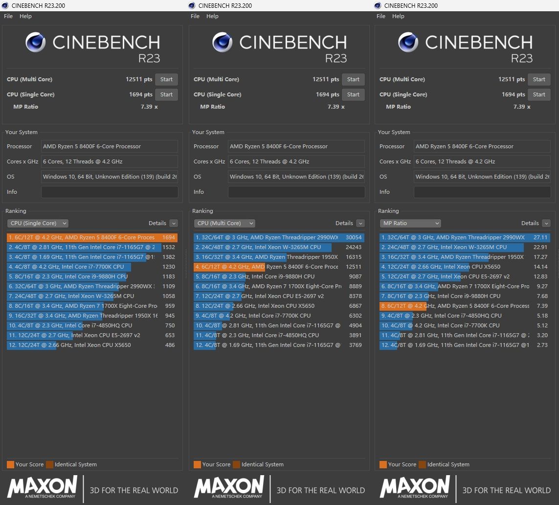 使用CINEBENCH R23软件测试,CPU单核性能得分:1694 pts,CPU多核性能得分:12511 pts,MP Ratio得分:7.39 x。