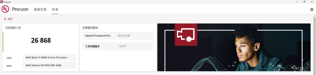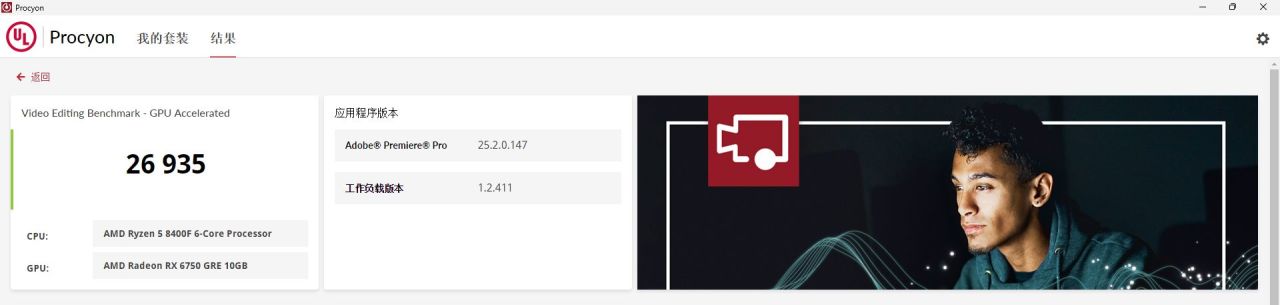 使用Procyon软件对整机硬件进行测试,在视频编辑基准测试分数的测试页面,也就是基于Adobe Premiere Pro进行测试,在开启GPU选项的情况测试如下: