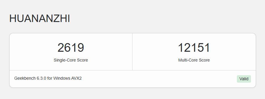 用GeekBench 6.3.0软件测试,CPU单核性能得分:2619,CPU多核性能得分:12151。