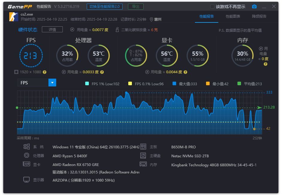 经过实测,在玩《CS2》这款游戏时,使用AMD 锐龙 5 8400F处理器和AMD Radeon RX 6750 GRE 10GB显卡进行测试,在自定义画质下,实测1080P分辨率(1920× 1080)运行游戏,用游戏加加软件测得画面平均帧率能够稳定保持在213 帧/每秒,使用自带的FPS帧率测得画面平均帧率能够稳定保持在262.2 帧/每秒。