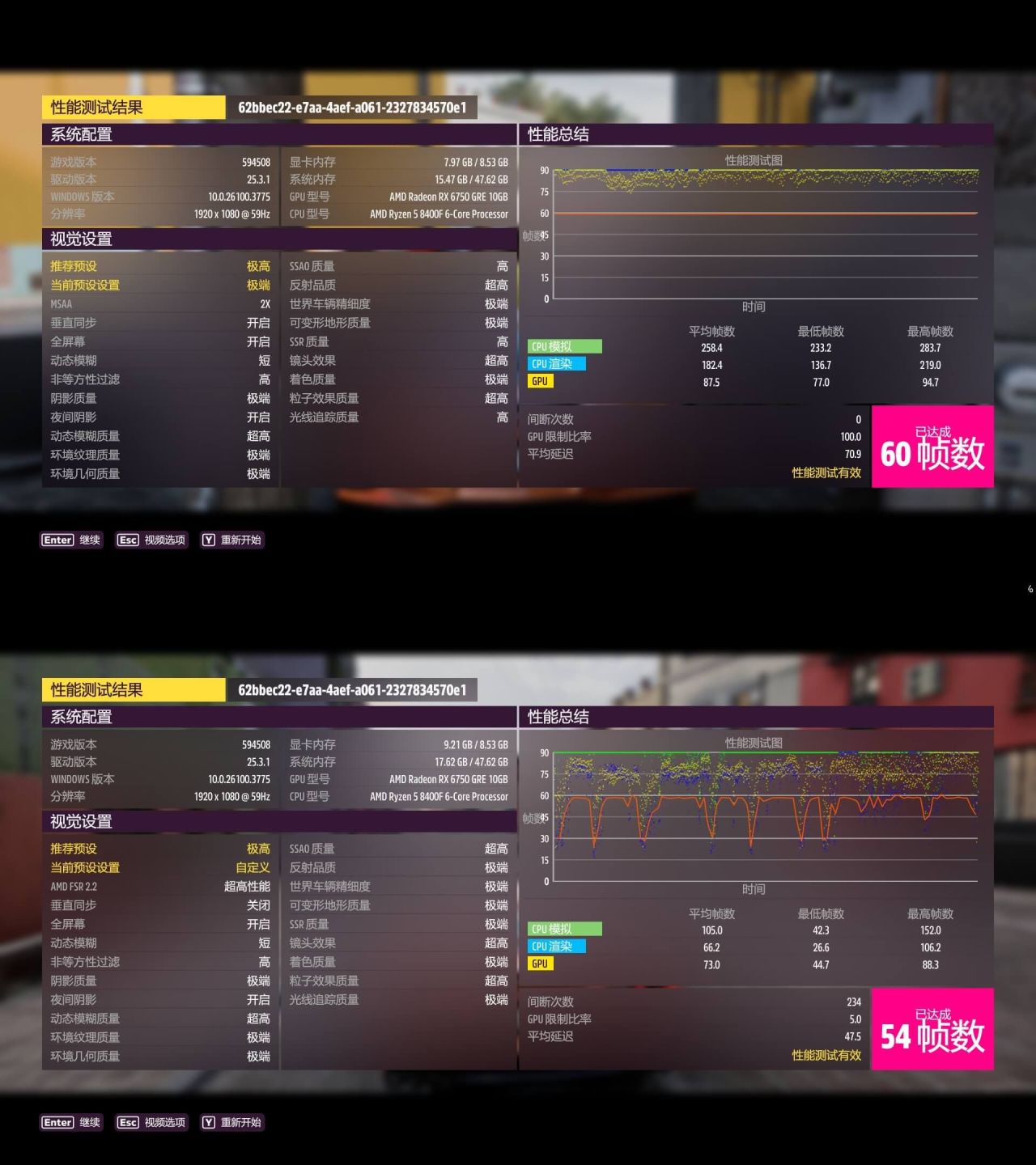 经过实测,在玩《极速地平线5》这款游戏时,使用AMD 锐龙 5 8400F处理器和AMD Radeon RX 6750 GRE 10GB显卡进行测试,在默认预设极端画质下,实测1080P分辨率(1920× 1080)运行游戏,画面平均帧率能够稳定保持在60 帧/每秒;在自定义画质下,实测1080P分辨率(1920× 1080)运行游戏,画面平均帧率能够稳定保持在54 帧/每秒。