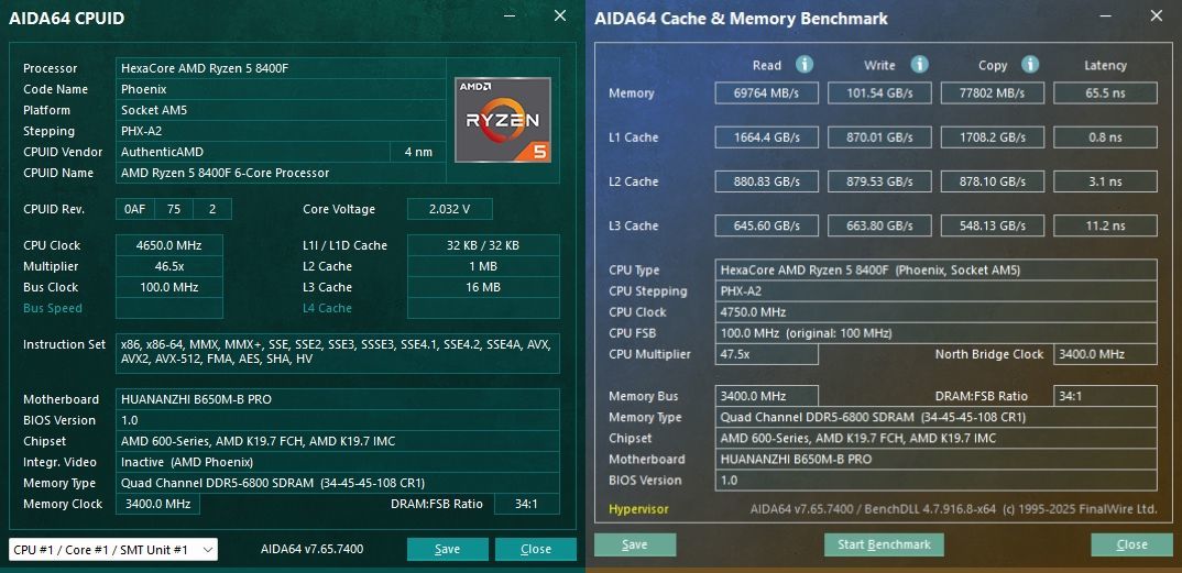 使用AIDA64软件测试,内存读取速度为:69764 MB/s,内存写入速度为:101.54 GB/s,内存拷贝速度为:77802 MB/s,而内存延迟为:65.5 ns。