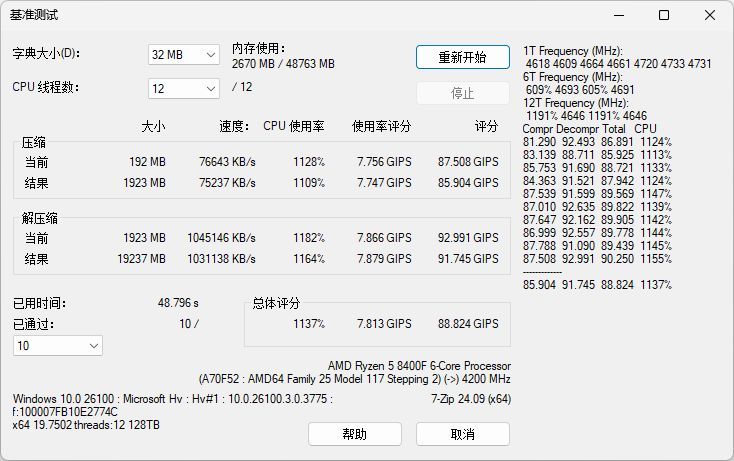 使用7-ZIP软件的基准测试,总体评分数据如图所示,CPU使用率:1137%,使用率评分:7.813 GIPS,评分:88.824 GIPS。