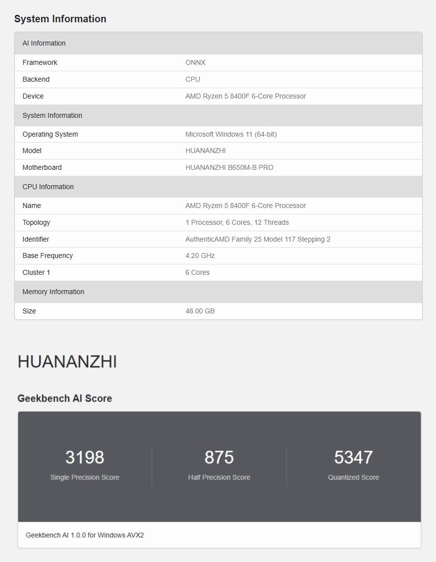 用GeekBench AI软件进行AI性能评测,在ONNX项目下进行CPU算力测试,Single Precision得分为:3198,Half Precision得分为:875,Quantized得分为:5347。