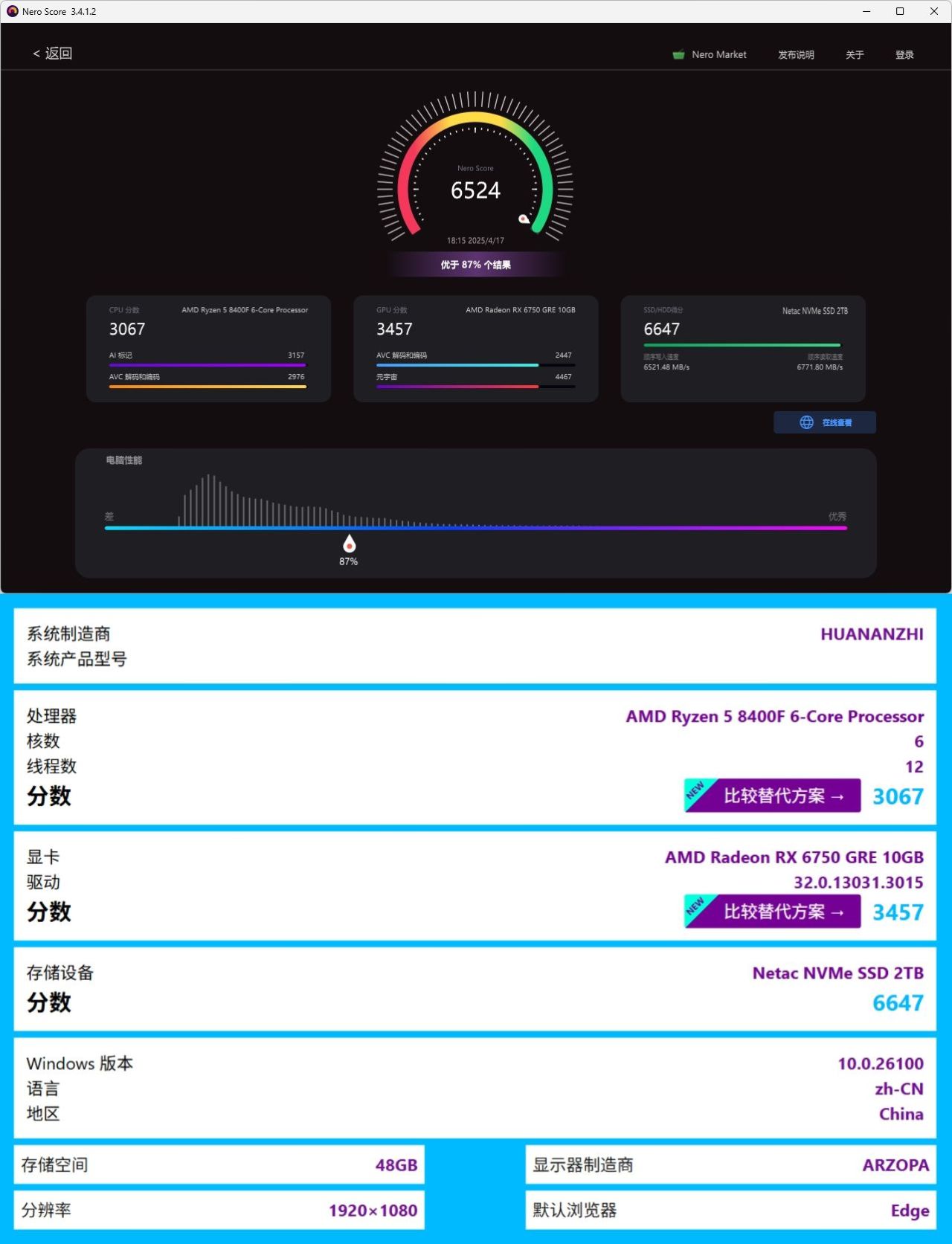 使用Nero Score软件对整机进行性能测试,其中CPU分数为:3067,GPU分数为:3457,SSD分数为:6647,而Nero Score的得分为:6524,电脑综合性能能够达到:87%。