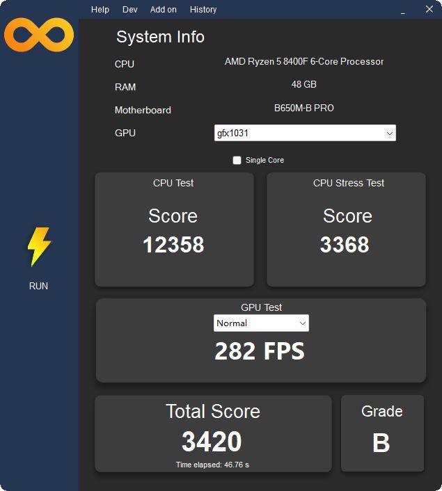 使用微软应用商店里的一款PC评测软件对整机进行性能测试,CPU测试得分:12358,CPU Stress测试得分:3368,GPU测试帧率为:282 FPS,总体得分为:3420,评分为:B。