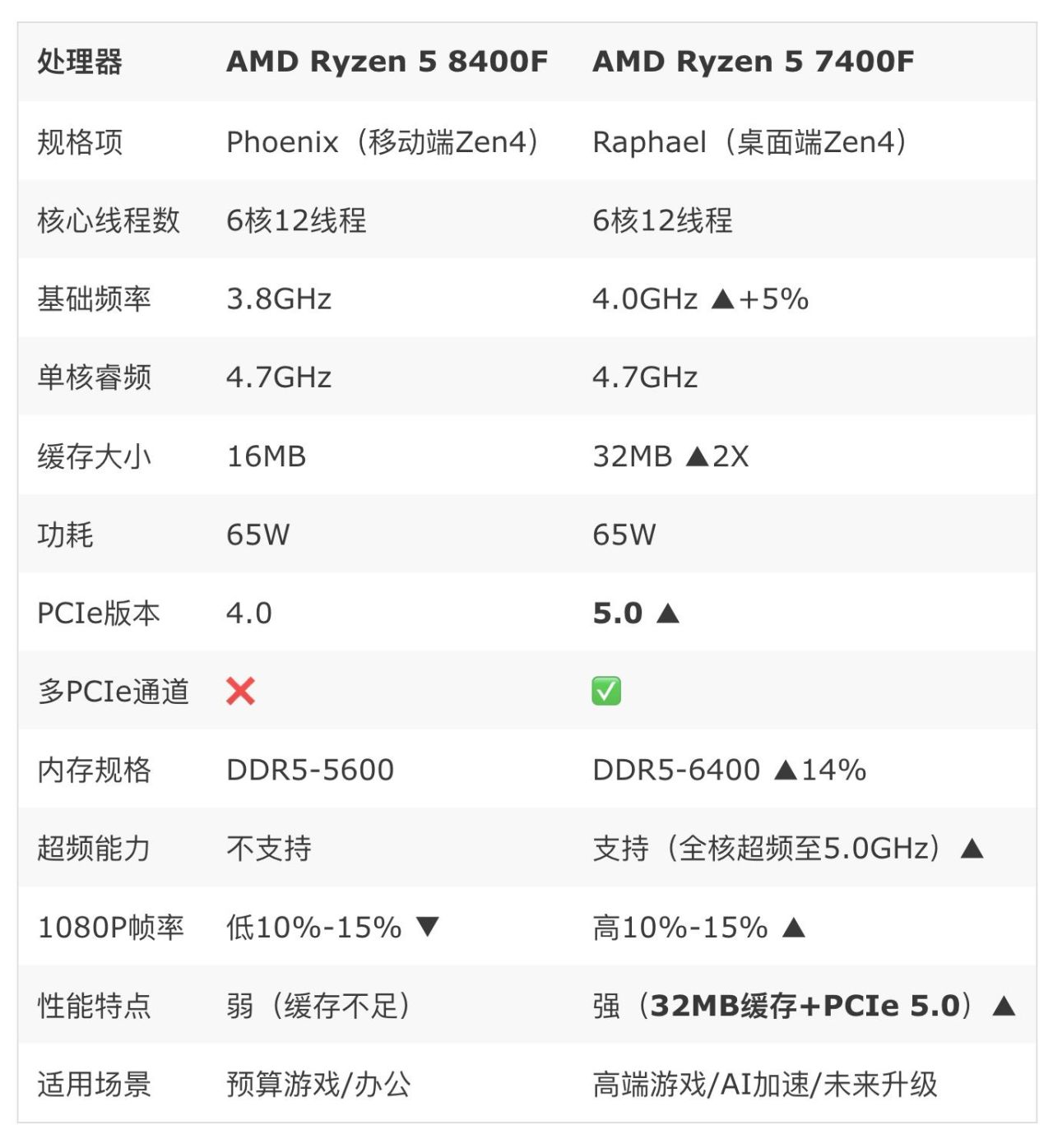 或许会有人疑惑,为什么不选择盒装的 AMD 锐龙 5 7400F,而是倾向于散片的 AMD 锐龙 5 8400F 呢?四海哥我从实际情况出发来分析。当前来看,PCIe 5.0 并非不可或缺的功能,无论是固态硬盘还是显卡,PCIe 4.0 都已经能够完全满足需求。再结合我的朋友并不会特意对 CPU 进行超频这一情况,默认频率下运行游戏已经绰绰有余。而散片版本的 AMD 锐龙 5 8400F 在价格上更具优势,相比盒装的 AMD 锐龙 5 7400F,足足便宜了约 300 元,性价比显然更高。