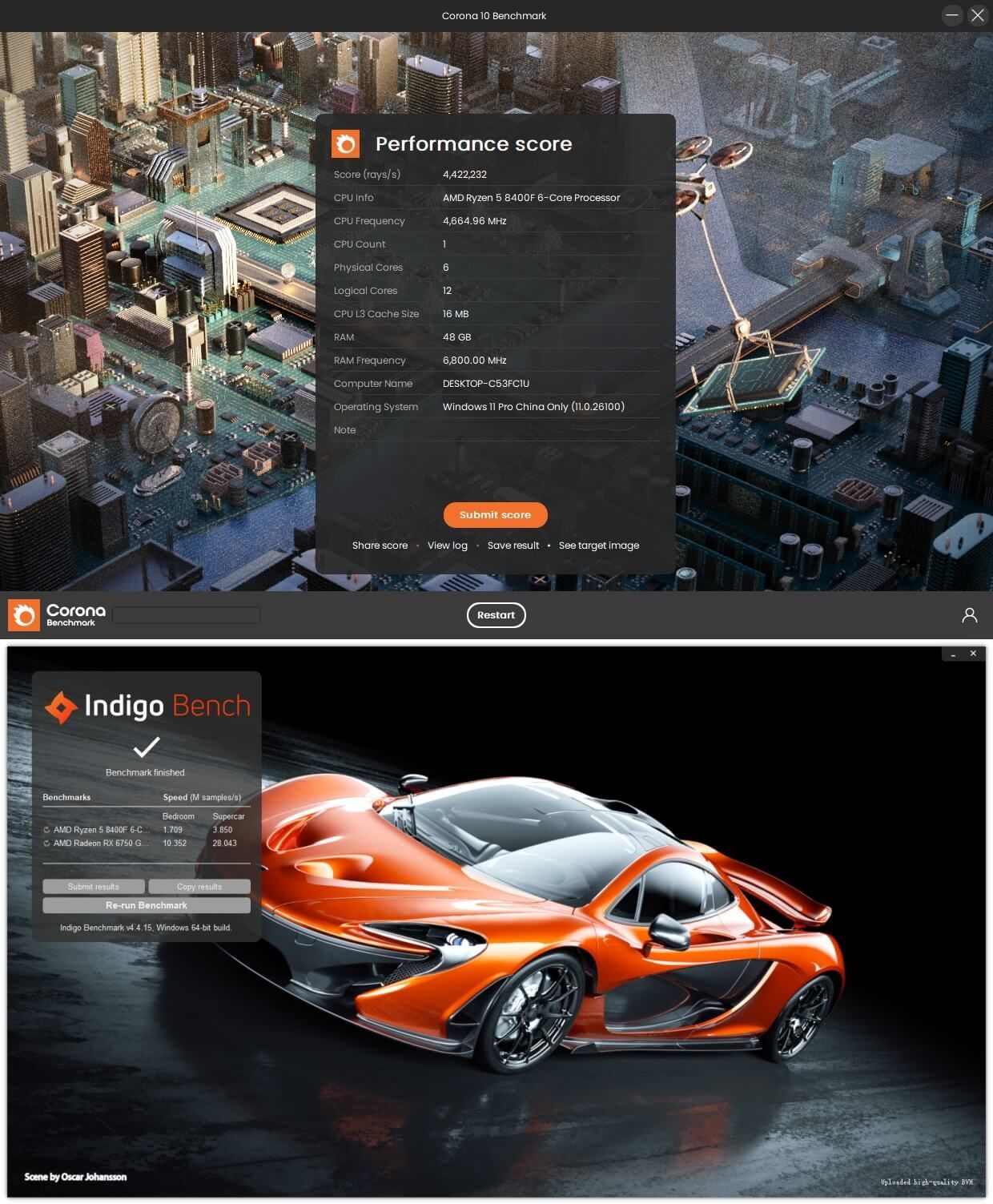 使用Corona 10 Benchmark软件测试,得分:4422232,使用Indigo Bench软件测试性能如图所示。