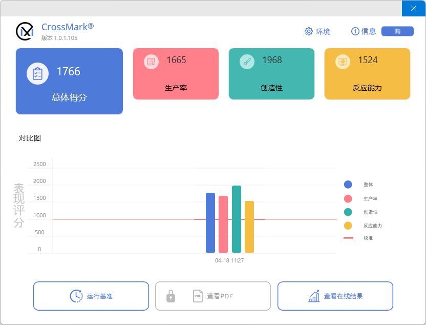 使用CrossMark评测软件对整机进行性能测试,其中总体得分为:1766,生产率得分为:1665,创造性得分为 :1968,反应能力得分为:1524。