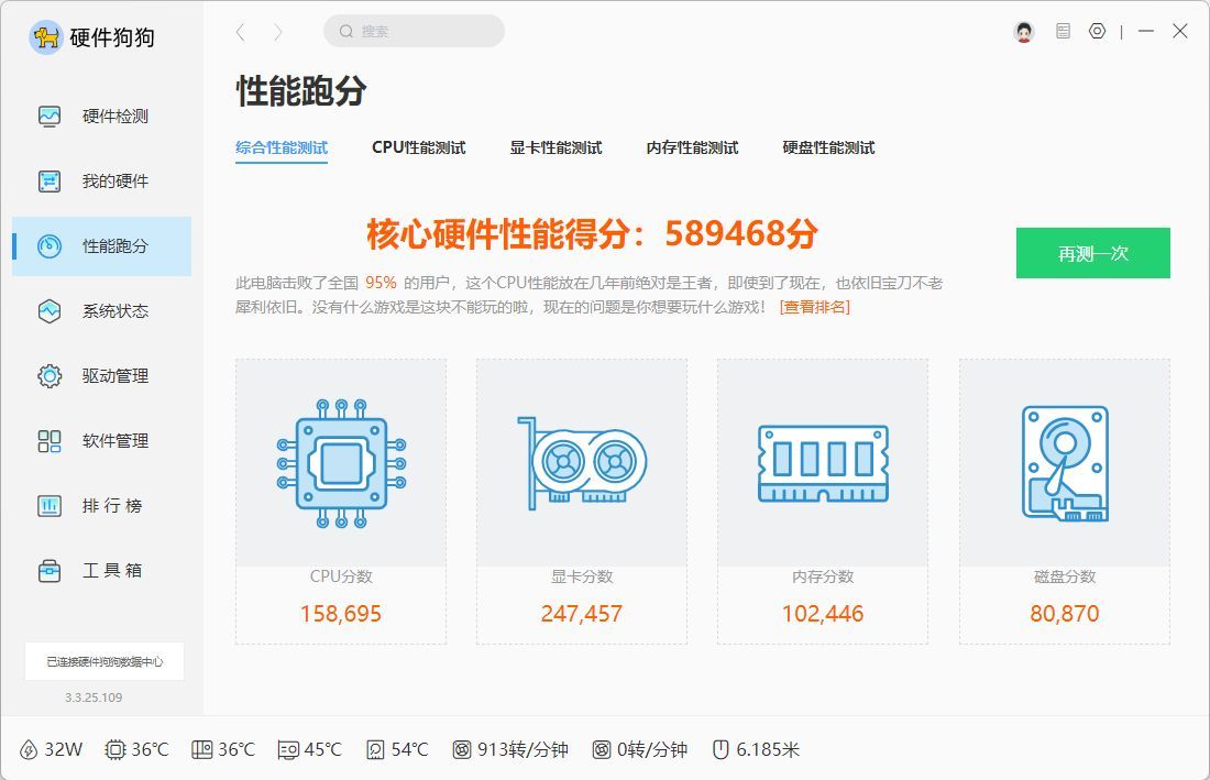使用硬件狗狗2025版软件对整机进行性能测试,其中CPU分数为:158695,显卡分数为:247457,内存分数为:102446,磁盘分数为:80870,核心硬件性能得分为:589468分,此电脑能够击败全国95%的用户。