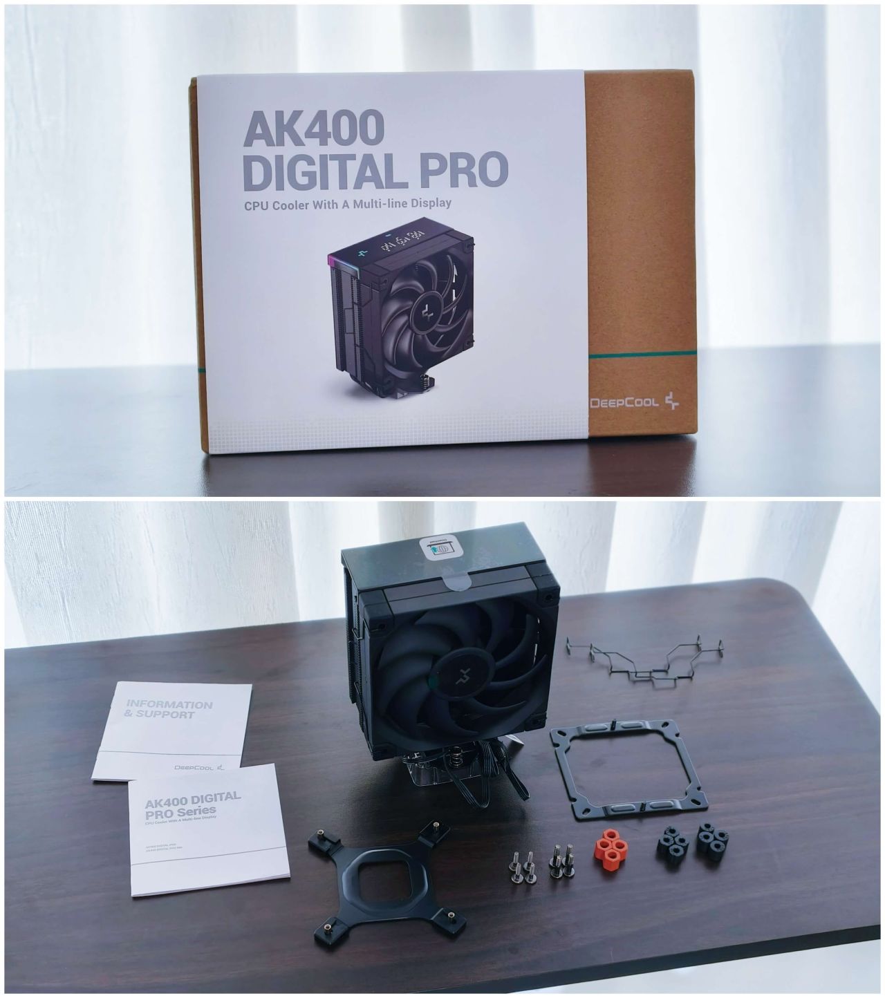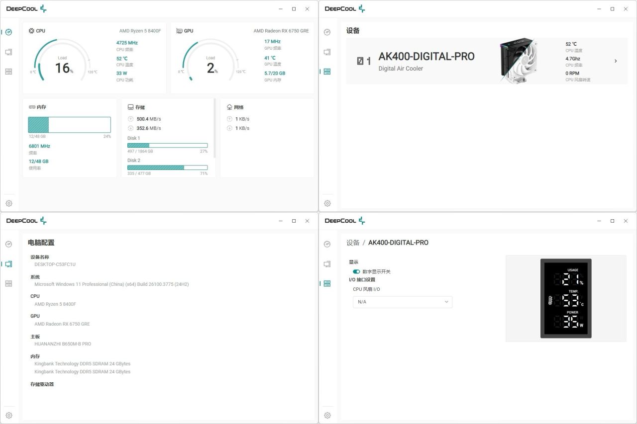九州风神AK400数显Pro这款风冷散热器在通电之后,能够清晰展示CPU的实时使用率、温度以及功耗数据,数显屏无疑是一项非常实用的技术。