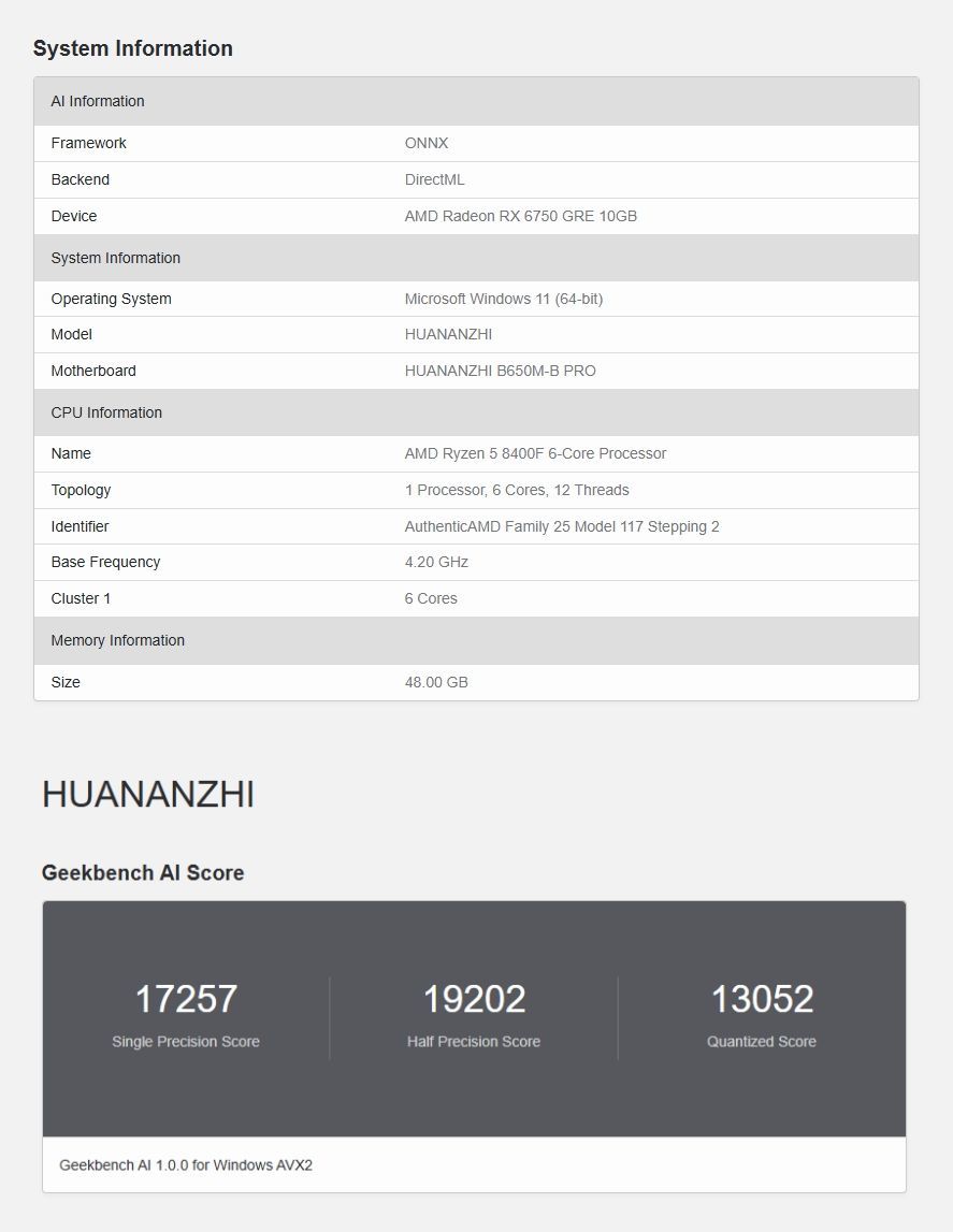 用GeekBench AI软件进行AI性能评测,在ONNX项目下进行DirectML(GPU)算力测试,Single Precision得分为:17257,Half Precision得分为:19202,Quantized得分为:13052。